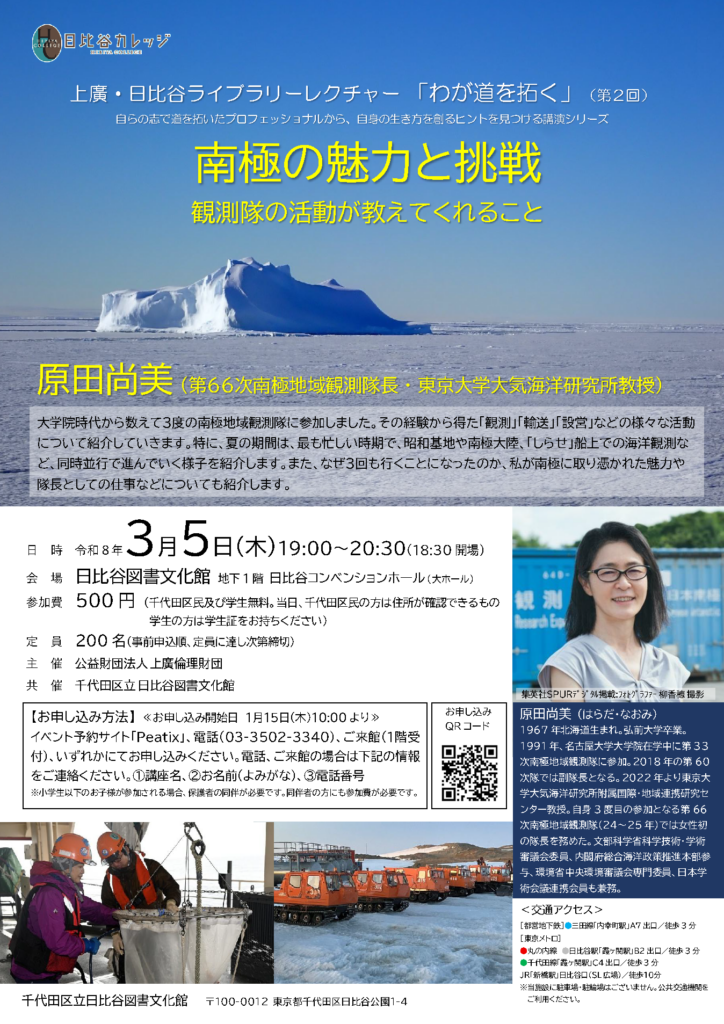 上廣・日比谷ライブラリーレクチャー「わが道を拓く」では、自らの志で道を拓いたプロフェッショナルから、自身の生き方を創るヒントを見つける講演シリーズです。日比谷図書文化館との共催行事として、1月29日に梯久美子氏(ノンフィクション作家)、3月5日に原田尚美氏(第66次南極地域観測隊長)にご講演頂きます。参加ご希望の方は下記の日比谷図書文化館ホームページへアクセスの上お申し込みください(各先着200名)。
